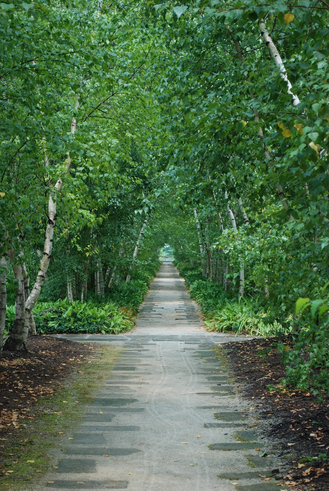 | A long fern lined portico leads up to a birch tree lined path. |